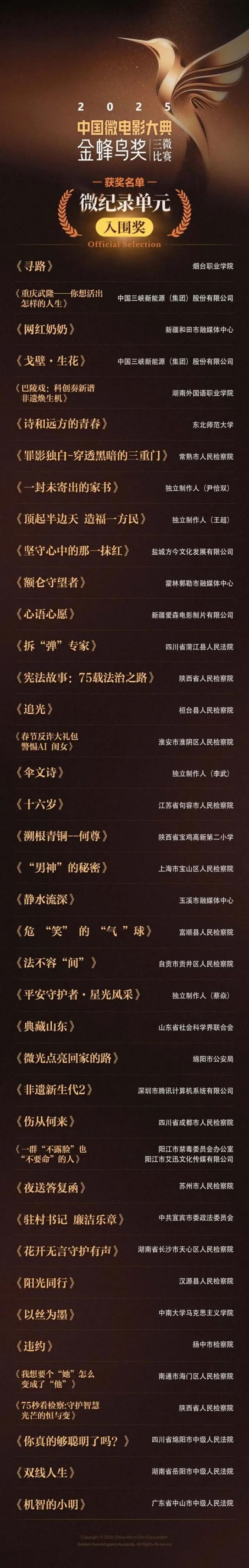 2025年12月30日,由新疆电影家协会指导、新疆爱森电影制片有限公司出品的纪录微电影《心语心愿》,成功斩获2025中国微电影大典“金蜂鸟奖”三微比赛微纪录单元入围奖。该赛事由中宣部、国家广电总局等16个部级单位联合指导,“金蜂鸟奖”三微比赛组委会、浙江法治报社、中共诸暨市委政法委联合承办,中广联合会法治传媒委员会、中国微电影大典青少年影视培训中心协办,在行业具有较高的权威性与社会影响力。